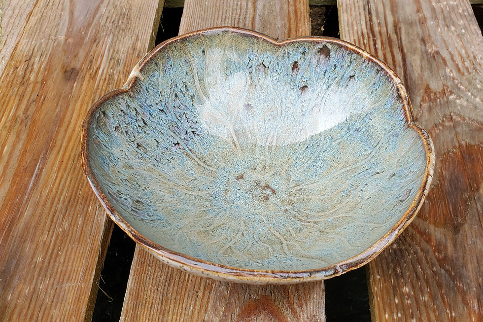 Flower-Shaped Stoneware Serving Bowl – Deep Blue with Ocean Green Ripples